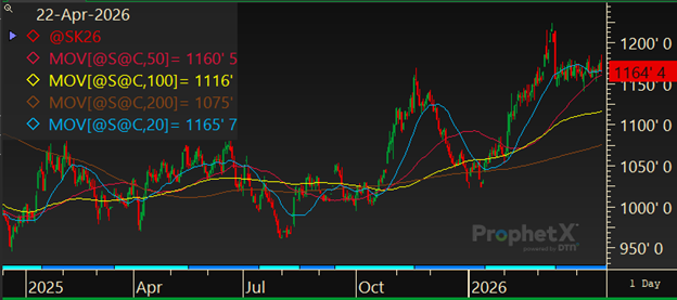 May soybeans formed a double top yesterday at 1183. 1183 will be a new resistance point. However, I can’t get too bearish soybeans here as soybean oil made a new contract high yesterday in the spot contract. Soybean oil at 73 cents is trading within the top one third of its 20-year trading range. Upside targets remain 1193, 1205, 1217.