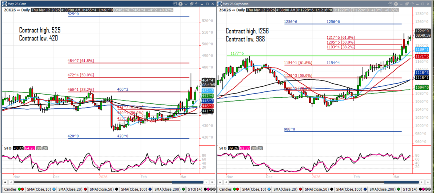 Both May corn and May soybeans have gapped higher for two consecutive sessions. Fibonacci resistance and the upside targets in the May corn contract are 472, 484, 525. Monday’s high at 476 for the corn and 1233 in the soybean contract may offer resistance as well. The sell stops are the 10-day moving averages in the contracts, 452 and 1189.