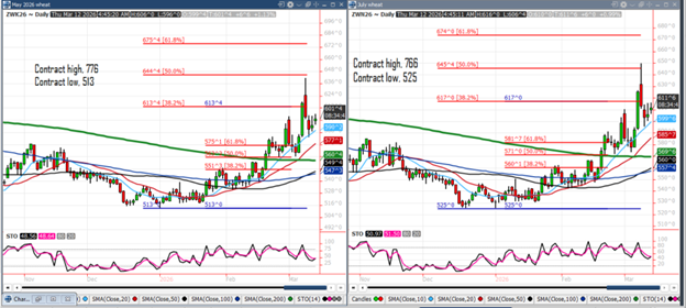 Wheat is being more of a follower here but is tracking the respective contract’s 10-day moving average higher. The upside targets in the May contract is 613, 644 and in the July contract is 617, 645.