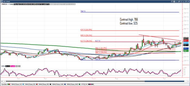 July wheat exceeded out 617 target yesterday but close above daily chart support now at 605. Upside targets remain 617, 645.